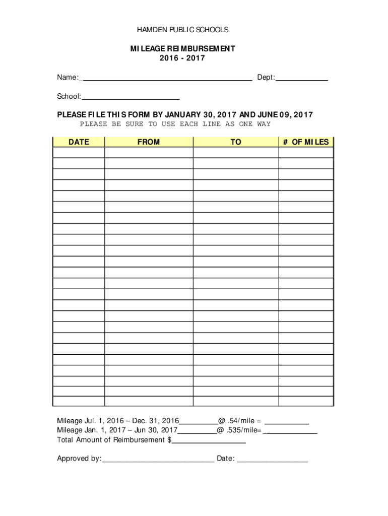 HAMDEN PUBLIC SCHOOLS MILEAGE REIMBURSEMENT 2016 2017 Name: Dept:School: PLEASE FILE THIS FORM BY JANUARY 30, 2017, AND JUNE 09, 2017, PLEASE BE SURE TO USE EACH LINE AS ONE WAY DATEFROMMileage Jul.