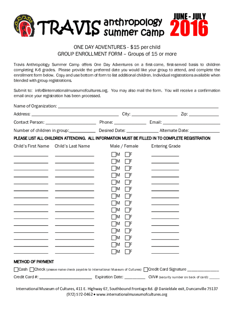 TRAVISanthropology summer camphene JULY2016ONE DAY ADVENTURES $15 per child GROUP ENROLLMENT FORM Groups of 15 or more Travis Anthropology Summer Camp offers One Day Adventures on a first come, first