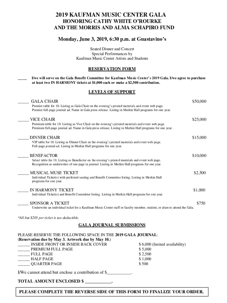 2019 KAUFMAN MUSIC CENTER GALA HONORING CATHY WHITE ROURKE AND THE MORRIS AND ALMA SHAPIRO FUND Monday, June 3, 2019, 6:30 p.m. at Gustations Seated Dinner and Concert Special Performances by Kaufman