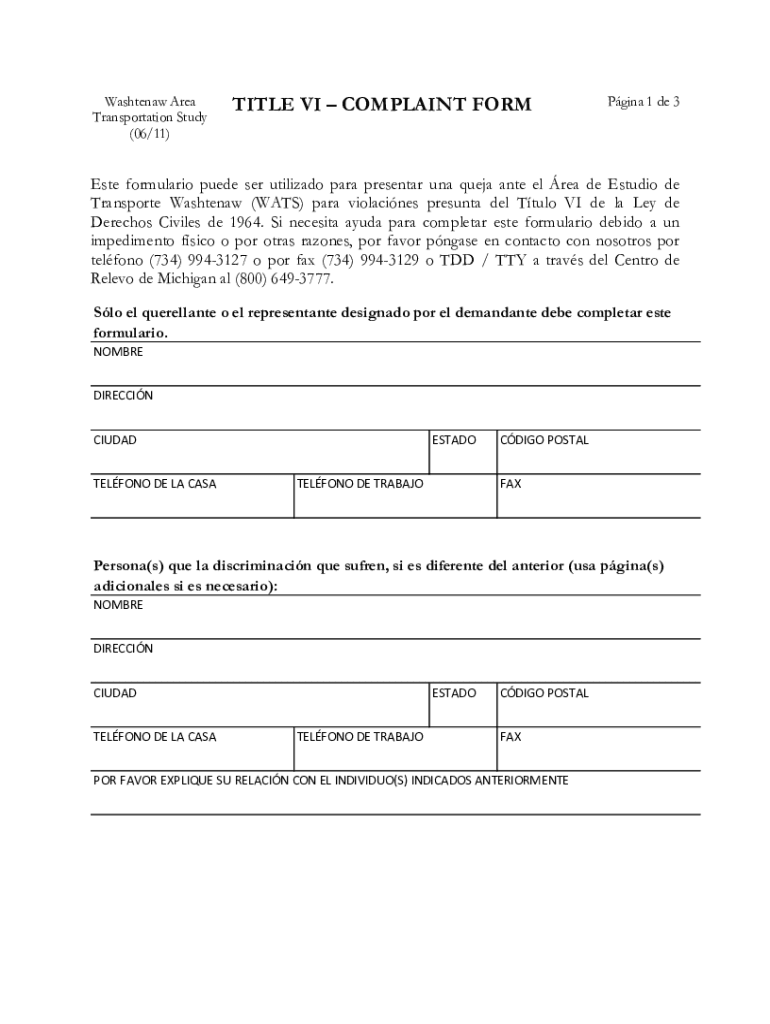 Washtenaw Area Transportation Study (06/11)TITLE VI COMPLAINT Forming 1 de 3Este formulation suede SER utilized para presenter RNA Queen ante el REA de Studio de Transporte Washtenaw (WATS) para villains