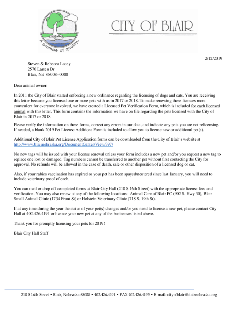 2/12/2019 Steven & Rebecca Lacey 2570 Larsen Dr Blair, NE 680080000 Dear animal owner: In 2011 the City of Blair started enforcing a new ordinance regarding the licensing of dogs and cats. You are