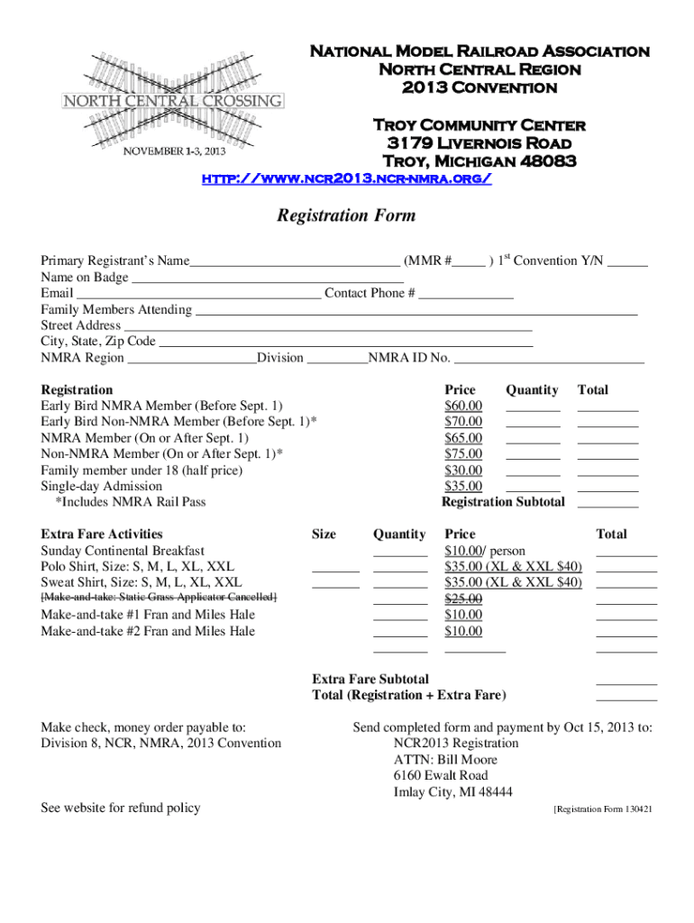 National Model Railroad Association North Central Region 2013 Convention Troy Community Center 3179 Liverpool Road Troy, Michigan 48083 http://www.ncr2013.ncrnmra.org/Registration Form Primary Registrants
