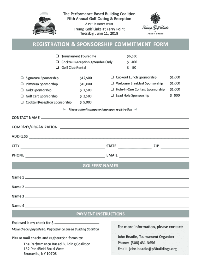 The Performance Based Building Coalition Fifth Annual Golf Outing reception A PPP Industry Event Trump Golf Links at Ferry Point Tuesday, June 11, 2019reGIsTraTIoN & sponsorship Commitment form Tournament