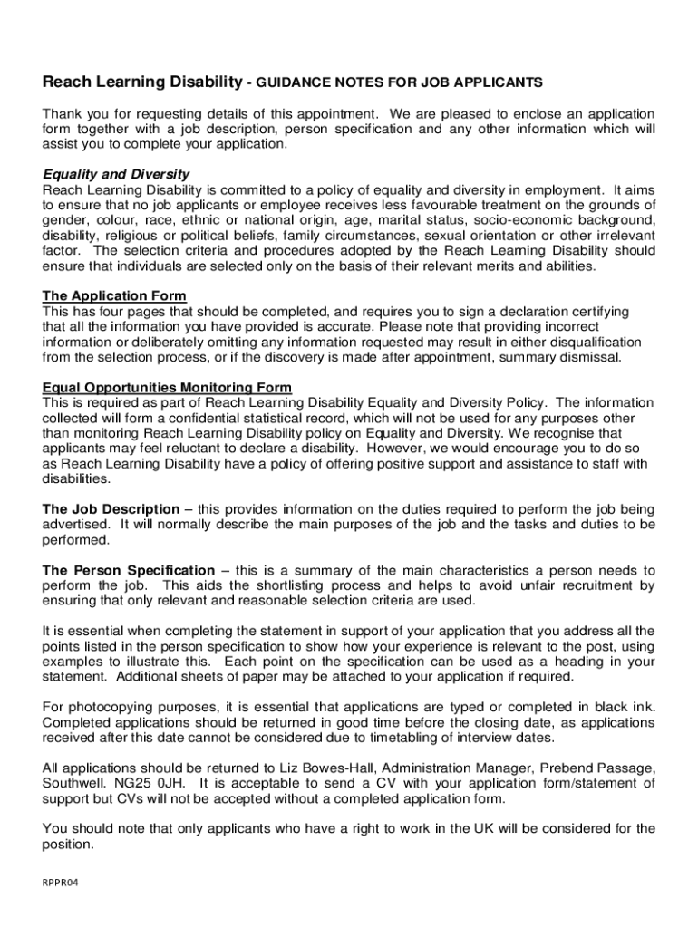 Reach Learning Disability GUIDANCE NOTES FOR JOB APPLICANTS Thank you for requesting details of this appointment. We are pleased to enclose an application form together with a job description, person