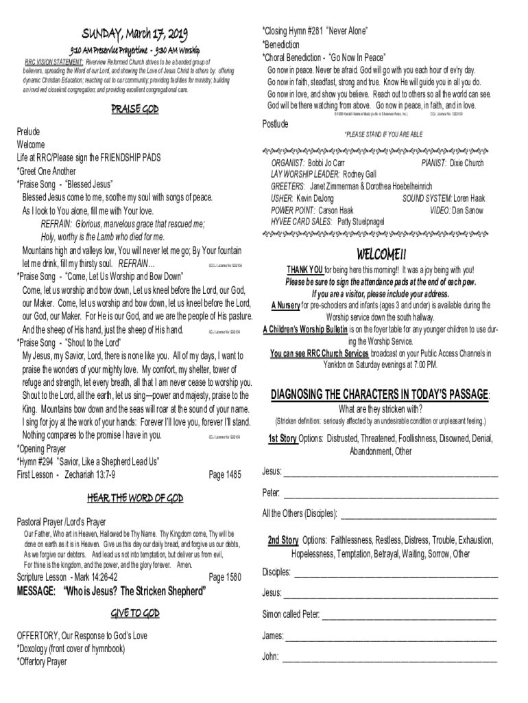 SUNDAY, March 17, 2019 9:10 AM Preservice Prayer time 9:30 AM Worship RRC VISION STATEMENT: Riverview Reformed Church strives to be a bonded group of believers, spreading the Word of our Lord, and