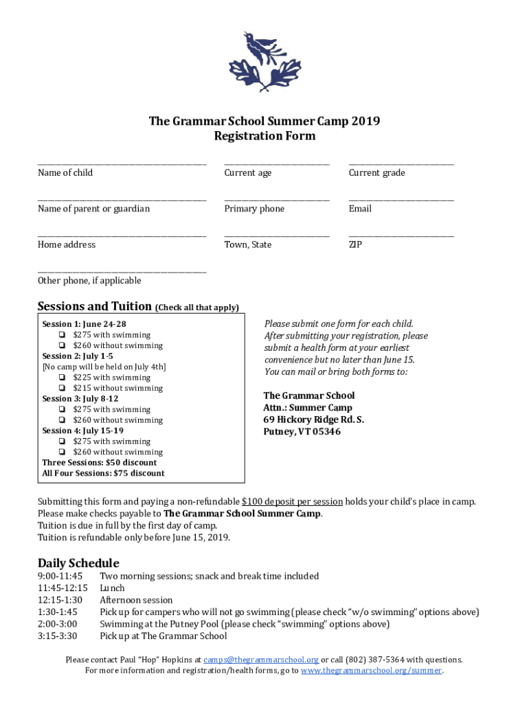 The Grammar School Summer Camp 2019 Registration Form Name of child Current age Current grade Name of parent or guardian Primary phone Email Home address Town, State ZIP Other phone, if applicableSessions