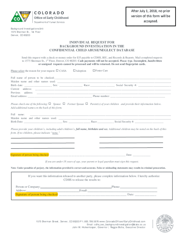 After July 1, 2018, no prior version of this form will be accepted. Background Investigations Unit 1575 Sherman St., 1st Floor Denver, CO 80203INDIVIDUAL REQUEST FOR BACKGROUND INVESTIGATION IN THE