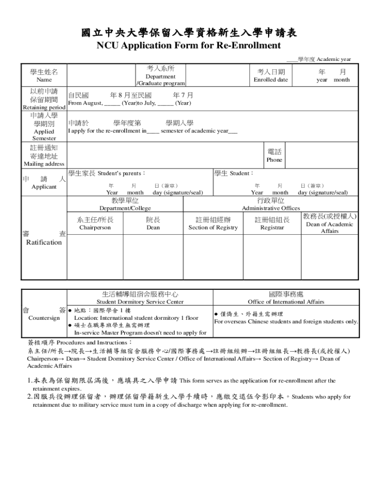 ICU Application Form for Enrollment Academic yearDepartment /Graduate programmed Retaining period 8 Enrolled dateyearmonth7From August, (Year)to July, (Year)I apply for the reenrollment in semester