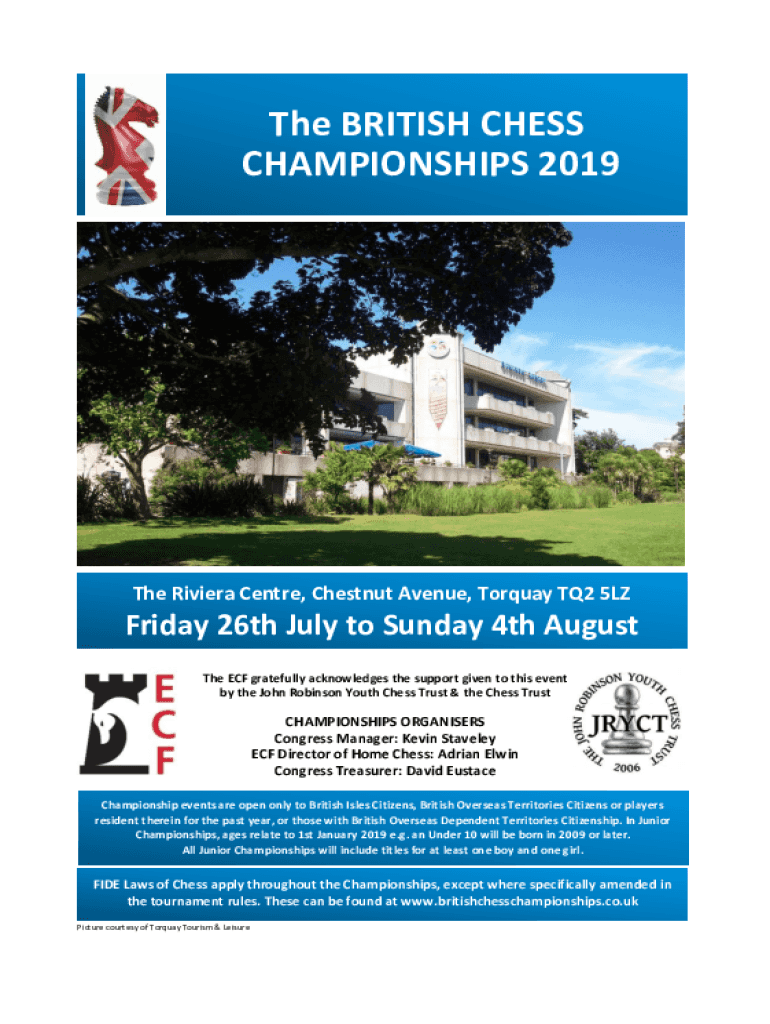 The BRITISH CHESS CHAMPIONSHIPS 2019The Riviera Center, Chestnut Avenue, Tor quay TQ2 5LZFriday 26th July to Sunday 4th August 2018 The ECF gratefully acknowledges the support given to this event