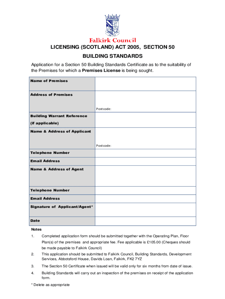 LICENSING (SCOTLAND) ACT 2005, SECTION 50 BUILDING STANDARDS Application for a Section 50 Building Standards Certificate as to the suitability of the Premises for which a Premises License is being