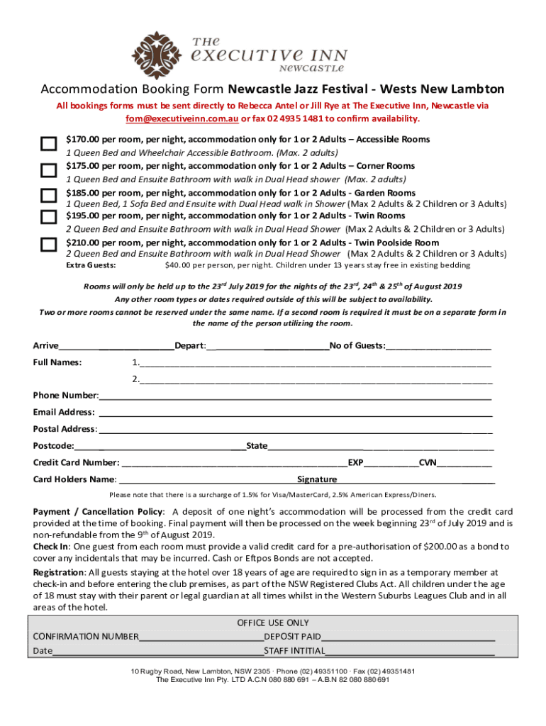 Accommodation Booking Form Newcastle Jazz Festival Wests New Lamb ton All bookings forms must be sent directly to Rebecca Angel or Jill Rye at The Executive Inn, Newcastle via for executiveinn.com.AU
