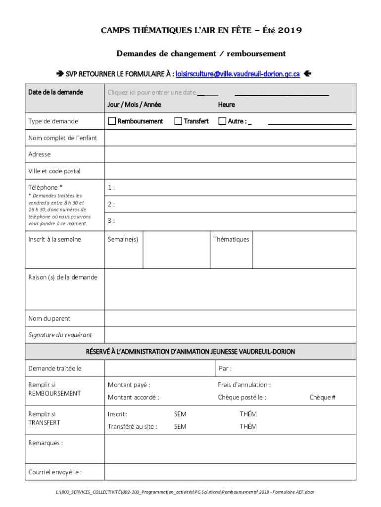 CAMPS THEMATIZES LAIR EN FTE t 2019 Demanded DE management / reimbursement SVP RETURNER LE FORMULA IRE : loisirsculture Villa.vaudreuildorion.QC.ca Date DE la demandeCliquez ICI pour enter one date.