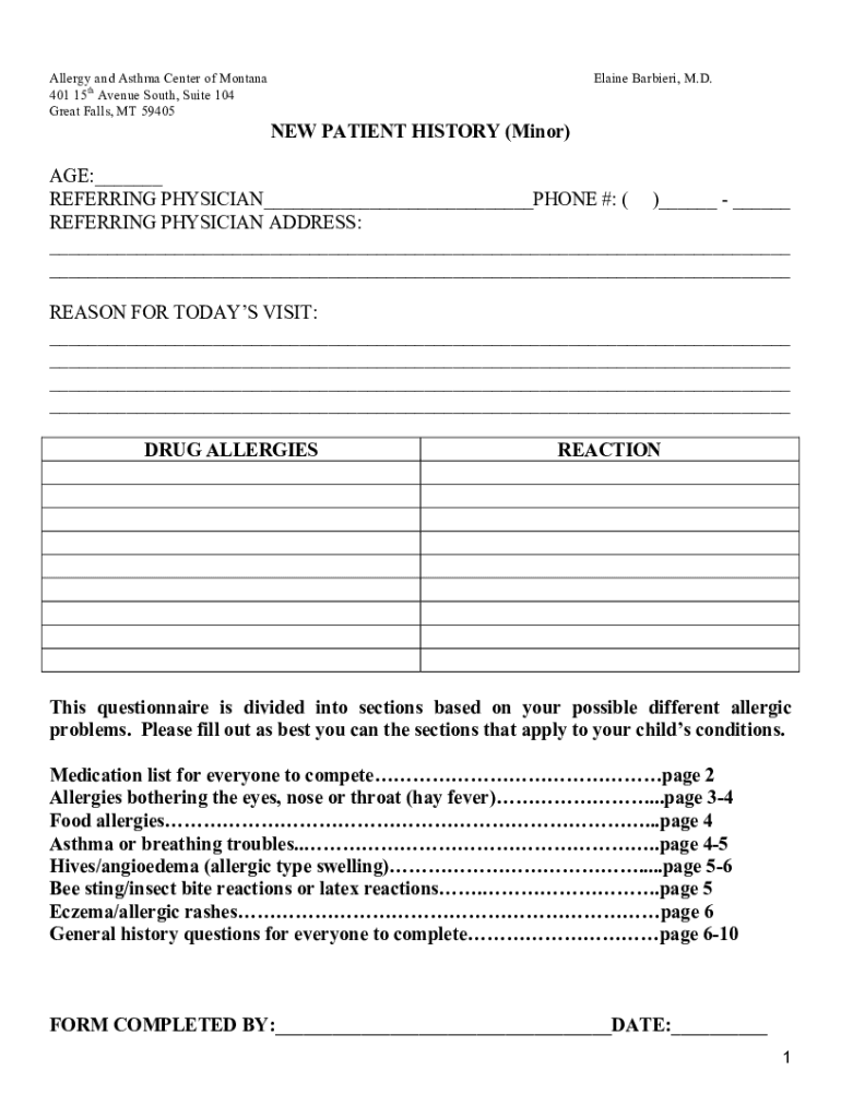 Allergy and Asthma Center of Montana 401 15th Avenue South, Suite 104 Great Falls, MT 59405Elaine Barrier, M.D.NEW PATIENT HISTORY (Minor) AGE: REFERRING PHYSICIAN PHONE #: () REFERRING PHYSICIAN