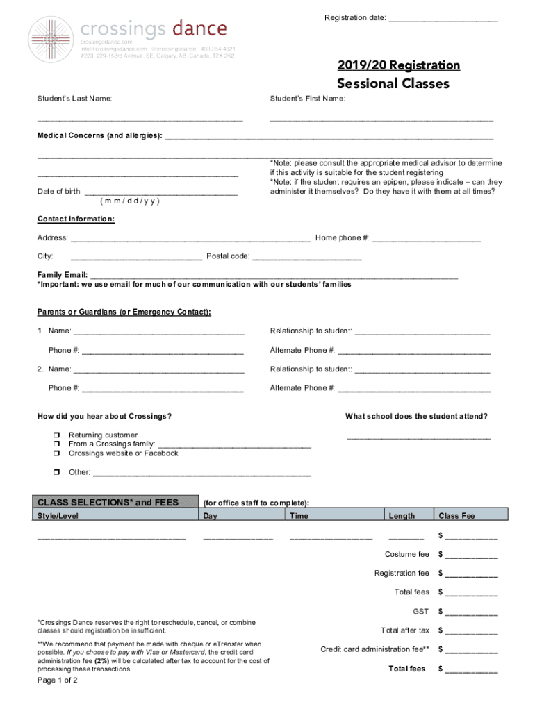 Registration date: 2019/20 RegistrationSessional Classes Students Last Name:Students First Name: Medical Concerns (and allergies): *Note: please consult the appropriate medical advisor to determine