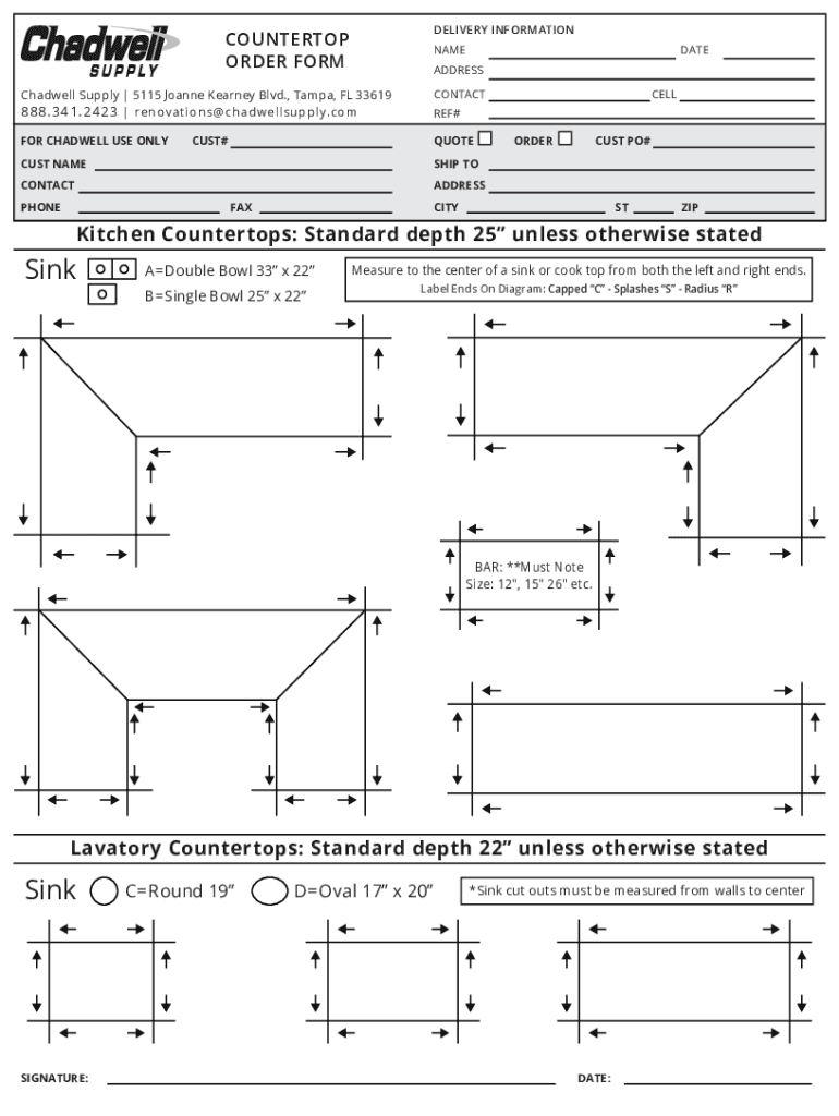 DELIVERY INFORMATIONCOUNTERTOP ORDER FORMDATENAME ADDRESSChadwell Supply 5115 Joanne Kearney Blvd., Tampa, FL 33619 888.341.2423 renovations chadwellsupply.comCONTACTFOR SHADWELL USE ONLYQUOTECUST#MUST