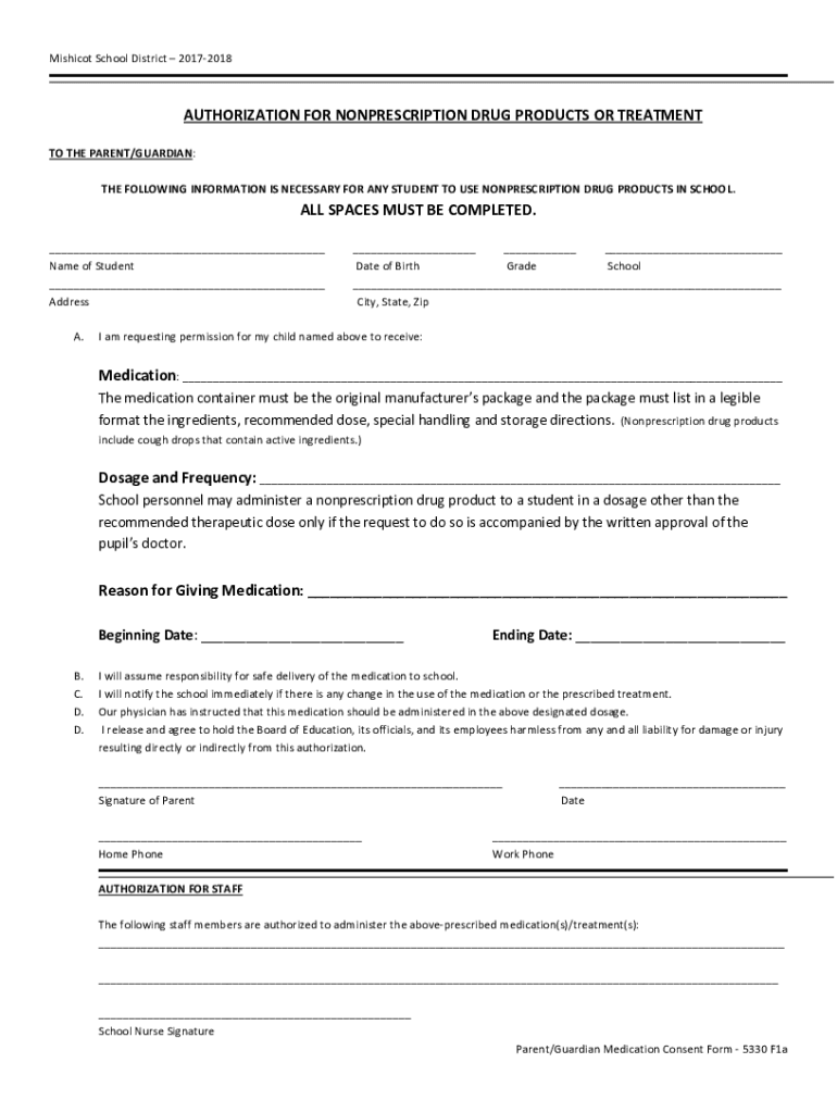 MishicotSchoolDistrict20172018 AUTHORIZATIONFORNONPRESCRIPTIONDRUGPRODUCTSORTREATMENT HOUSEPARENT/GUARDIAN: THEFOLLOWINGINFORMATIONISNECESSARYFORANYSTUDENTTOUSENONPRESCRIPTIONDRUGPRODUCTSINSCHOOL