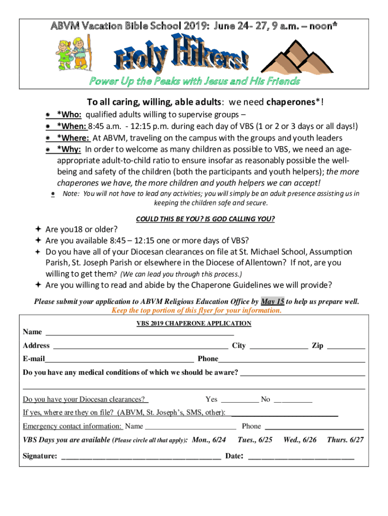 ABM Vacation Bible School 2019: June 24 27:9 a.m. noon×Power Up the Peaks with Jesus and His Friends To all caring, willing, able adults: we need chaperones*! *Who: qualified adults willing to supervise