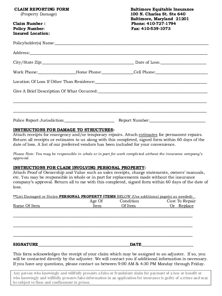 CLAIM REPORTING FORM (Property Damage)Baltimore Equitable Insurance 100 N. Charles St. Ste 640 Baltimore, Maryland 21201 Phone: 4107271794 Fax: 4105391073Claim Number : Policy Number: Insured Location:Policyholder(s)