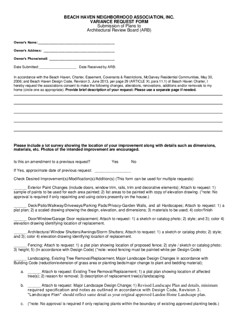 BEACH HAVEN NEIGHBORHOOD ASSOCIATION, INC. VARIANCE REQUEST FORM Submission of Plans to Architectural Review Board (ARB) Owners Name: Owners Address: Owners Phone/email: Date Submitted: Date Received