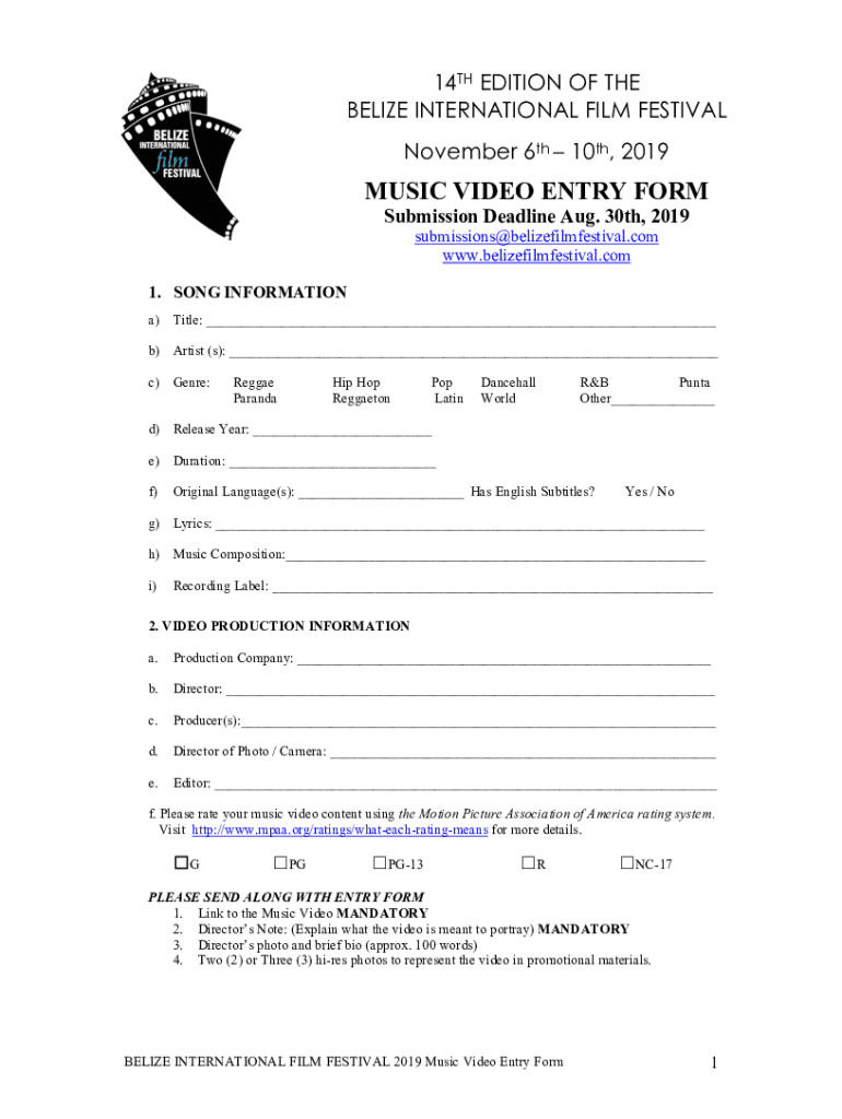 14TH EDITION OF THE BELIZE INTERNATIONAL FILM FESTIVAL November 6th 10th, 2019MUSIC VIDEO ENTRY FORM Submission Deadline Aug. 30th, 2019 submissions belizefilmfestival.com www.belizefilmfestival.com1.