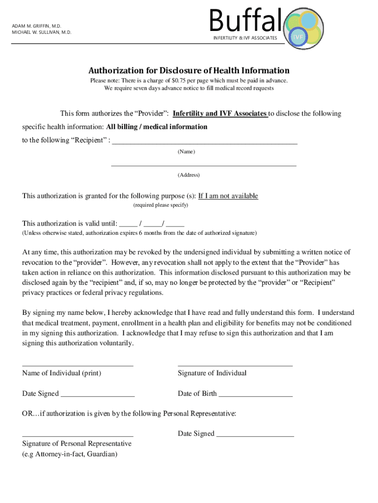 BuffalADAM M. GRIFFIN, M.D. MICHAEL W. SULLIVAN, M.D.INFERTILITY & IVF ASSOCIATESAuthorization for Disclosure of Health Information Please note: There is a charge of $0.75 per page which must be paid