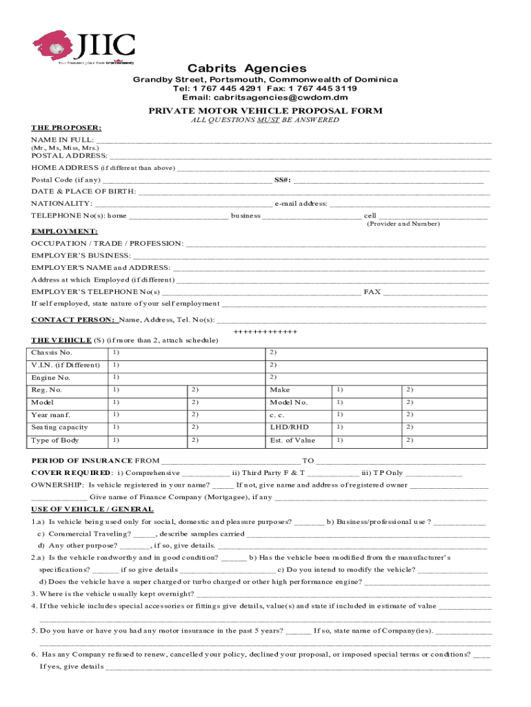 Carries Agencies Grandly Street, Portsmouth, Commonwealth of Dominica Tel: 1 767 445 4291 Fax: 1 767 445 3119 Email: cabritsagencies whom. Private MOTOR VEHICLE PROPOSAL FORM ALL QUESTIONS MUST BE