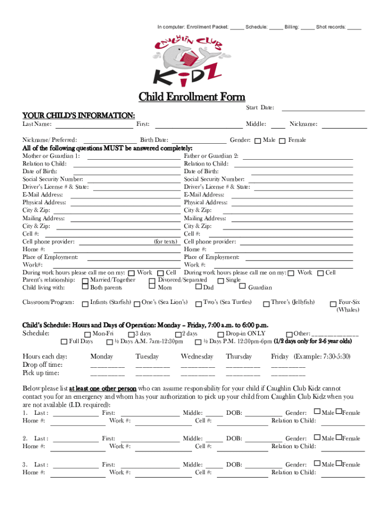 In computer: Enrollment Packet: Schedule: Billing: Shot records: Child Enrollment Form Start Date:YOUR CHILD INFORMATION: Last Name:First:Nickname/ Preferred:Middle:Birth Date:Gender:Nickname:MaleFemaleAll