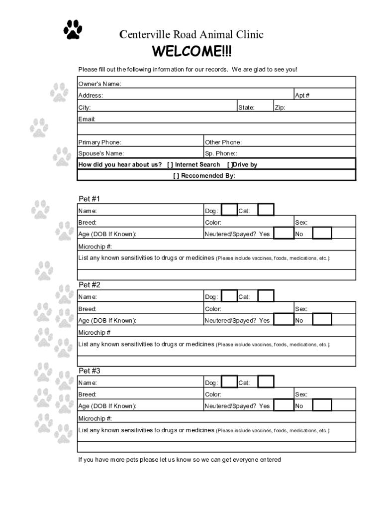 Centerville Road Animal ClinicWELCOME!!! Please fill out the following information for our records. We are glad to see you! Owner's Name: Address:Apt #City:State:Zip:Email:Primary Phone:Other Phone:Spouse's