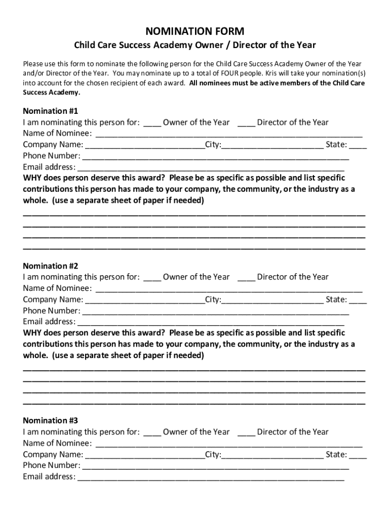NOMINATION Orchid Care Success Academy Owner / Director of the Year Please use this form to nominate the following person for the Child Care Success Academy Owner of the Year and/or Director of the