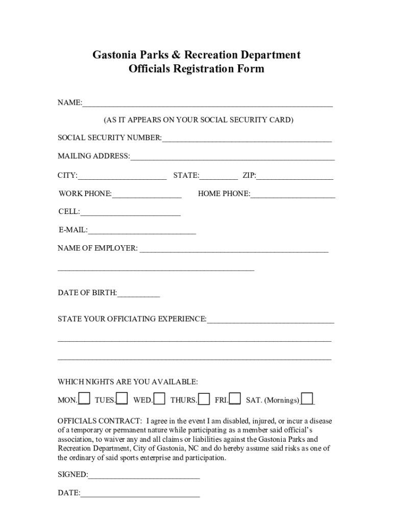 GastoniaParks&RecreationDepartment OfficialsRegistrationForm NAME: (ASITAPPEARSONYOURSOCIALSECURITYCARD) SOCIALSECURITYNUMBER: MAILINGADDRESS: CITY: STATE: ZIP: WORKSHOP: HOMOPHONE: CELL: EMAIL: NAMEOFEMPLOYER: