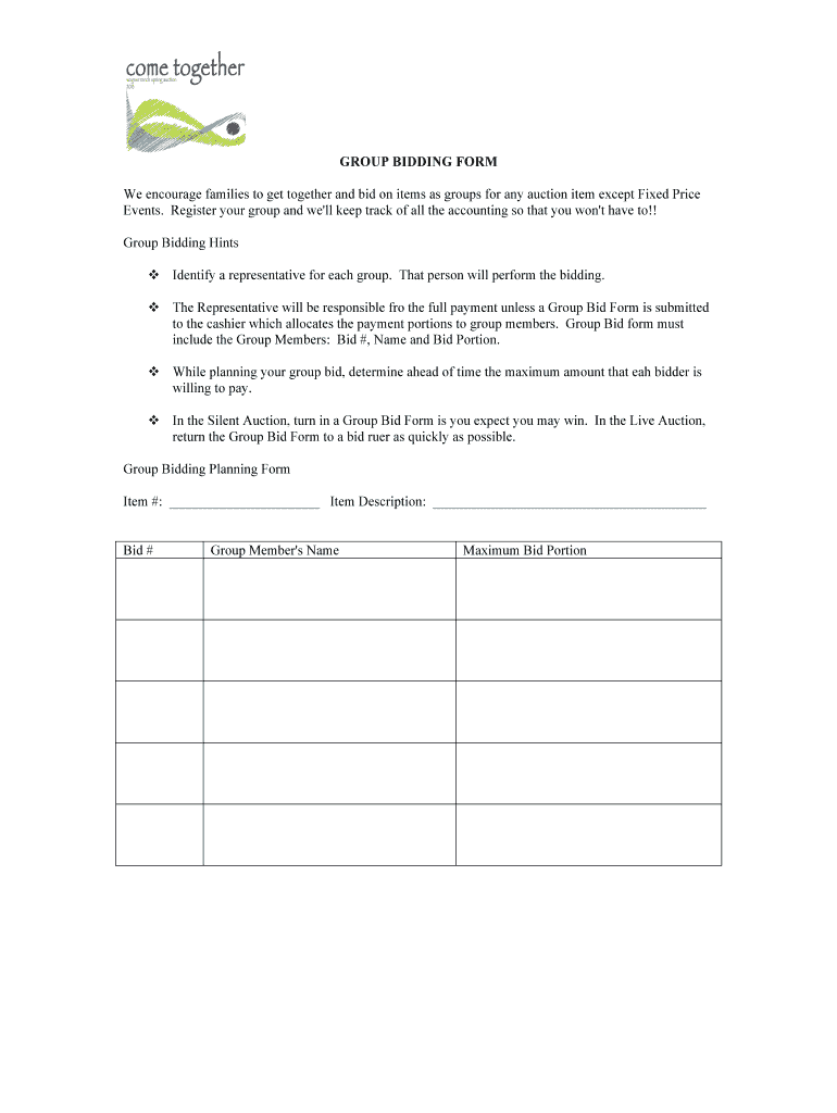 The Group Bidding Form can be used by any group of individuals participating in an auction, such as families or friends who want to bid together. Each group must designate a representative to submit the form.