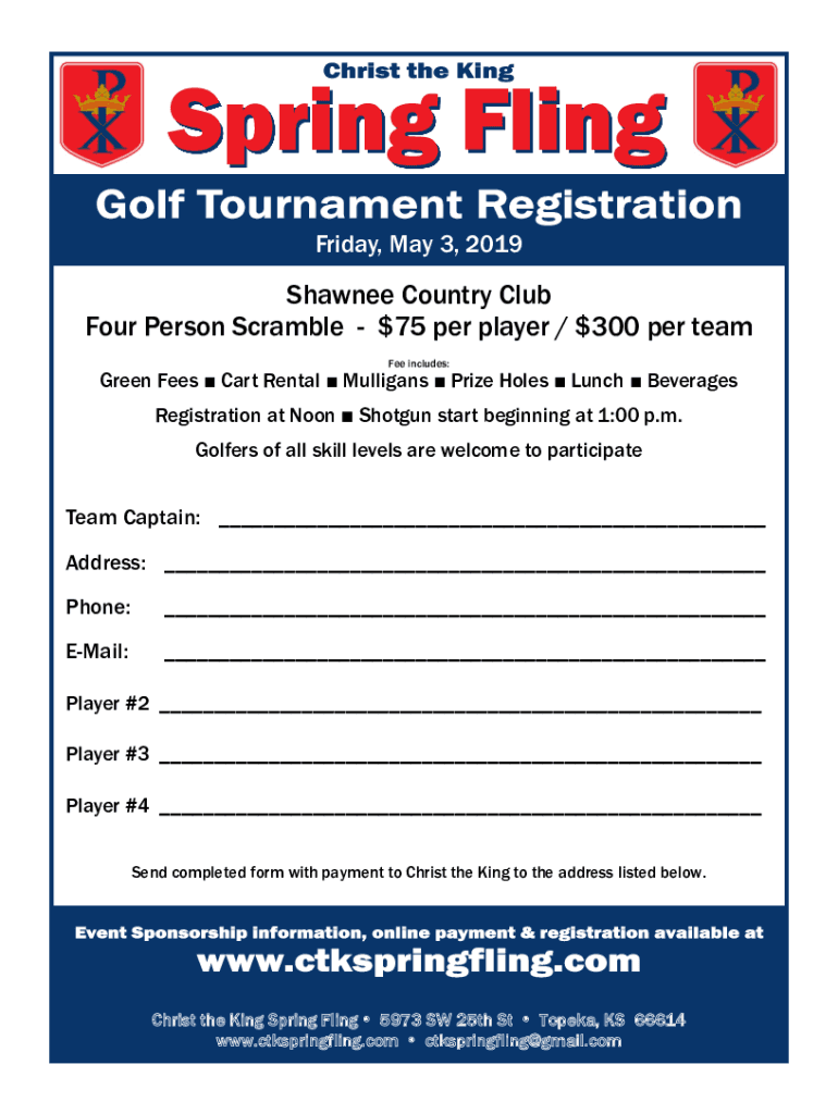 Spring Fling Friday, May 3, 2019Shawnee Country Club Four Person Scramble $75 per player / $300 per team Fee includes:Green Fees Cart Rental Mulligans Prize Holes Lunch Beverages Registration at Noon