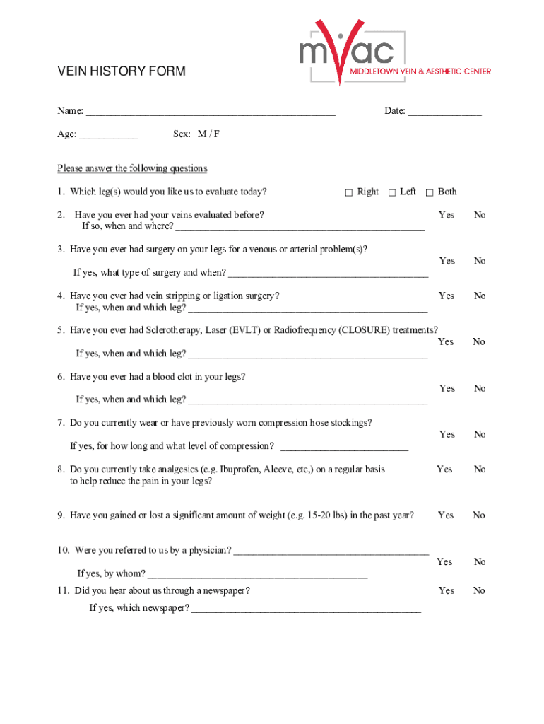 VEIN HISTORY FORM Name: Age: Date: Sex: M / Please answer the following questions 1. Which leg(s) would you like us to evaluate today? 2. RightLeftBothHave you ever had your veins evaluated before?