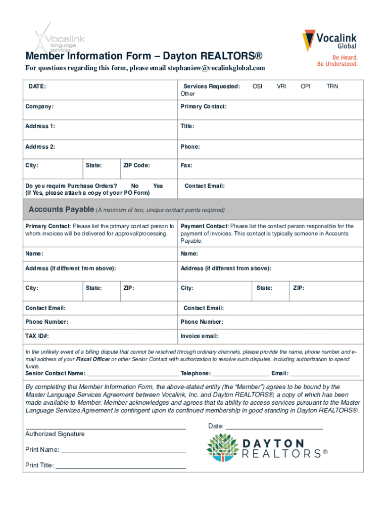 Member Information Form Dayton REALTORS For questions regarding this form, please email Stephanie vocalinkglobal.com DATE:Services Requested: Intercompany:Primary Contact: Address 1:Title: Address