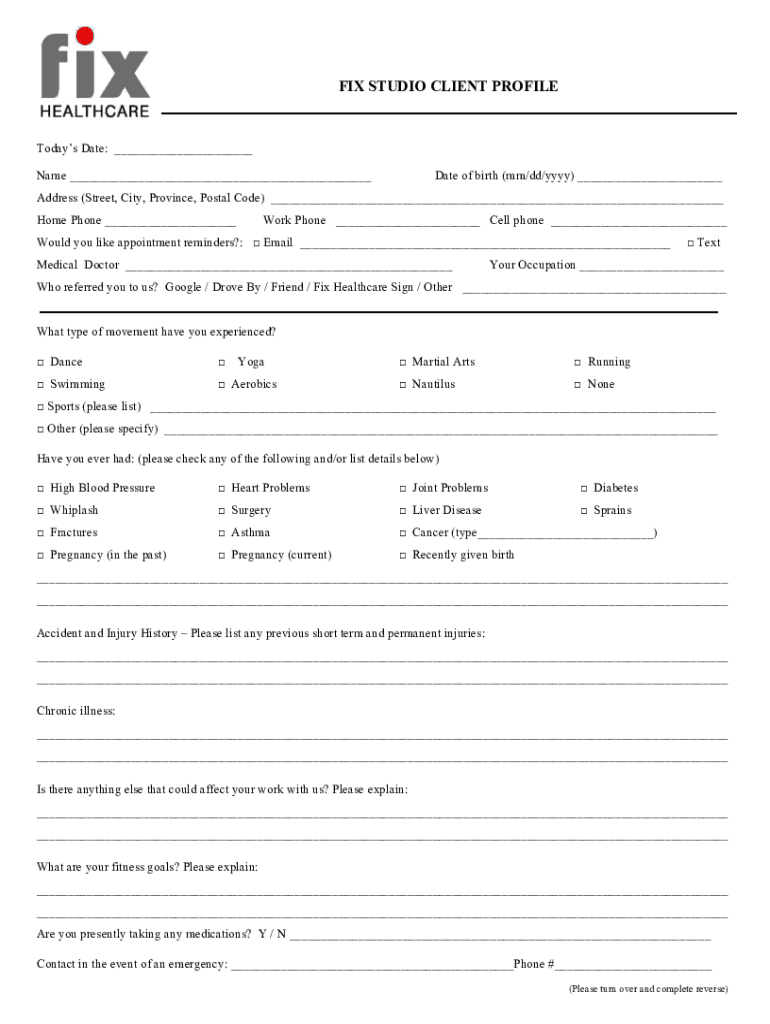 FIX STUDIO CLIENT PROFILETodays Date: Name Date of birth (mm/dd/YYY) Address (Street, City, Province, Postal Code) Home Phone Work Phone Cell phone Would you like appointment reminders?: Email Medical