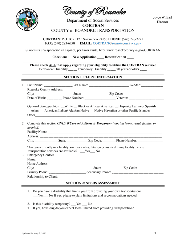 County of Roanoke Department of Social Services FORTRAN COUNTY of ROANOKE TRANSPORTATION Joyce W. Earl DirectorCORTRAN: P.O. Box 1127, Salem, VA 24153 PHONE: (540) 7767271 FAX: (540) 2836750 EMAIL: