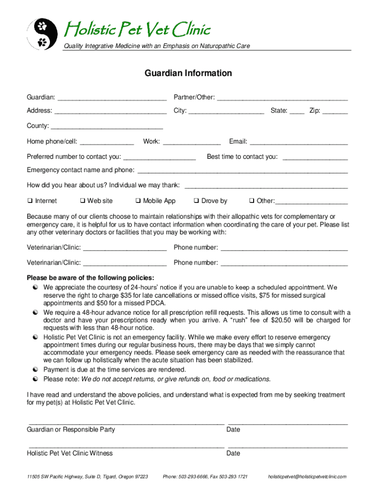Holistic Pet Vet Clinic Quality Integrative Medicine with an Emphasis on Naturopathic La Guardia Information Guardian: Partner/Other: Address: City: State: Zip: County: Home phone/cell: Work: Preferred