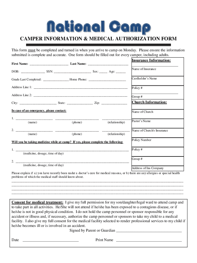N a t i on an l C an m p CAMPER INFORMATION & MEDICAL AUTHORIZATION From This form must be completed and turned in when you arrive to camp on Monday. Please ensure the information submitted is complete