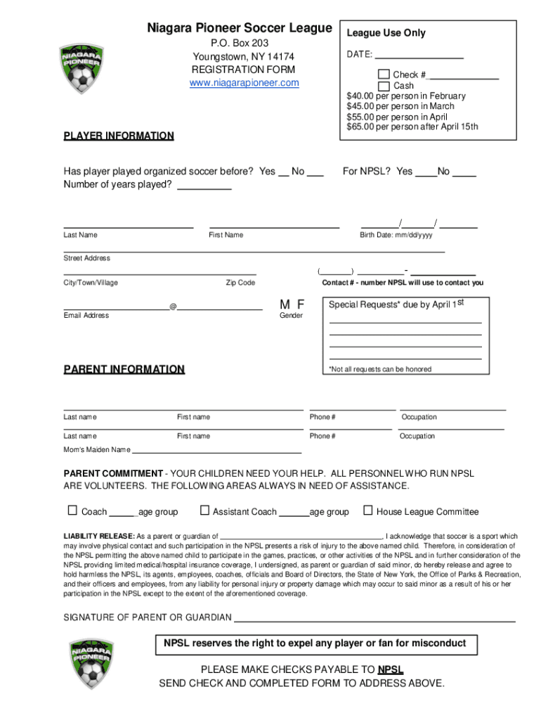 Niagara Pioneer Soccer League P.O. Box 203 Youngstown, NY 14174 REGISTRATION FORM www.niagarapioneer.comLeague Use Only DATE: Check # Cash $40.00 per person in February $45.00 per person in March