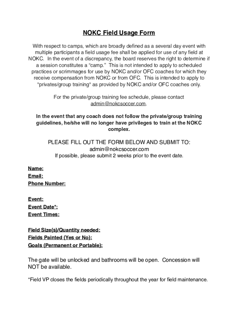 NOK Field Usage Form With respect to camps, which are broadly defined as a several day event with multiple participants a field usage fee shall be applied for use of any field at NOK. In the event