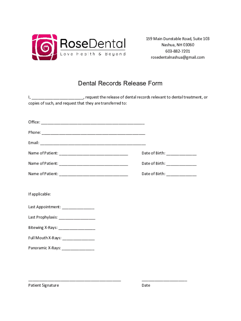 159 Main Unstable Road, Suite 103 Nashua, NH 03060 6038827201 rosedentalnashua Gmail. Mental Records Release Form I, request the release of dental records relevant to dental treatment, or copies of