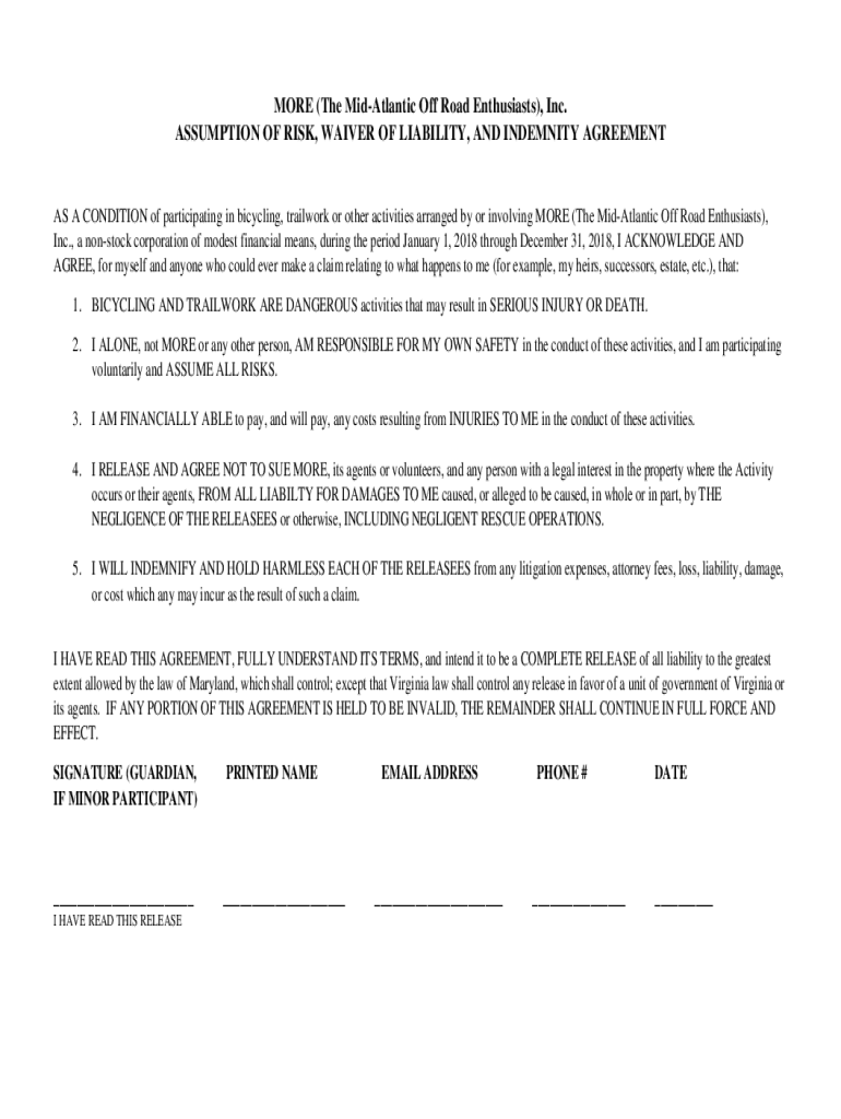 ASSUMPTION OF RISK, WAIVER OF LIABILITY, AND INDEMNITY AGREEMENTS A CONDITION of participating in bicycling, trail work or other activities arranged