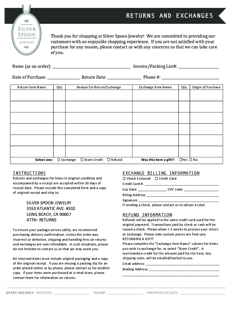 RETURNS AND EXCHANGESThank you for shopping at Silver Spoon Jewelry! We are committed to providing our customers with an enjoyable shopping experience. If you are not satisfied with your purchase