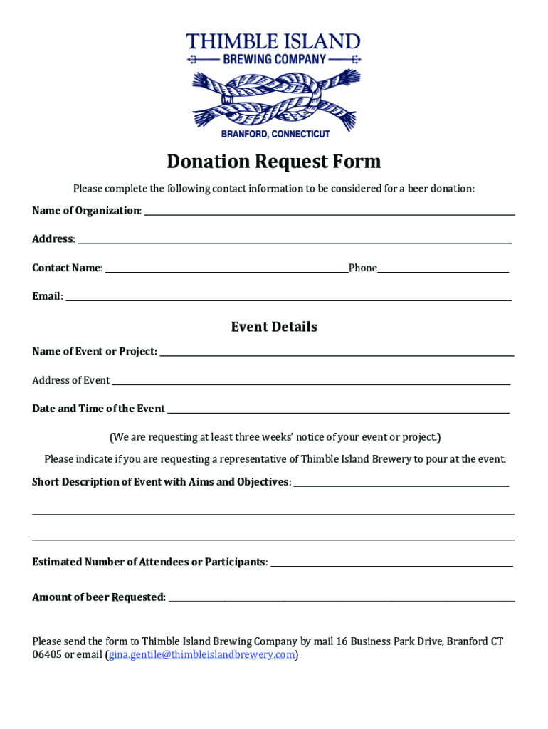 Donation Request Formulas complete the following contact information to be considered for a beer donation:Name of Organization: Address: Contact Name: Phone Email: Event DetailsName of Event or Project: