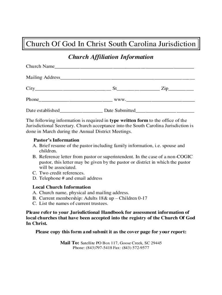 Church Of God In Christ South Carolina Jurisdiction Church Affiliation Information Church Name Mailing Address City St Zip Phone WWW. Date established Date Submitted The following information is required