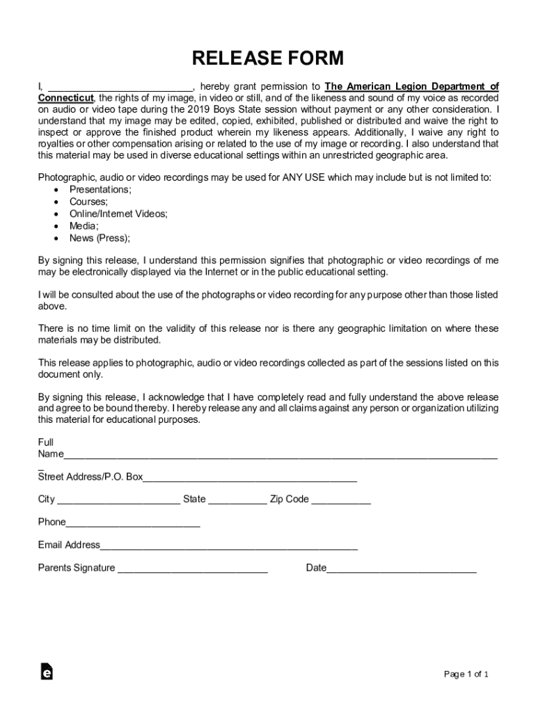 RELEASE FORM I, hereby grant permission to The American Legion Department of Connecticut, the rights of my image, in video or still, and of the likeness and sound of my voice as recorded on audio