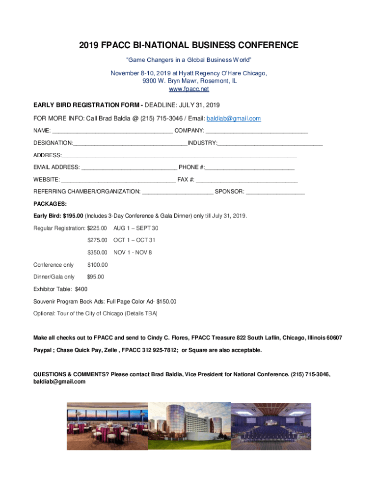 2019 FP ACC BINATIONAL BUSINESS CONFERENCE Game Changers in a Global Business World November 810, 2019 at Hyatt Regency Their Chicago, 9300 W. Bryan Mar, Rosamond, IL www.fpacc.net EARLY BIRD REGISTRATION