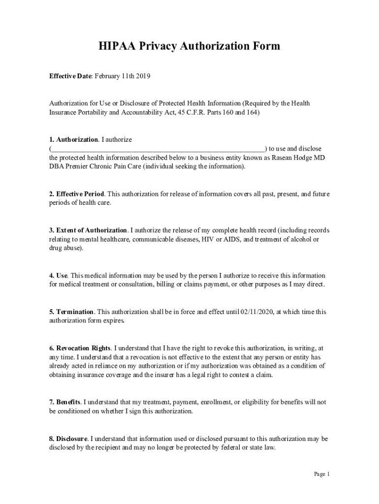 HIPAA Privacy Authorization Form Effective Date: February 11th 2019Authorization for Use or Disclosure of Protected Health Information (Required by the Health Insurance Portability and Accountability