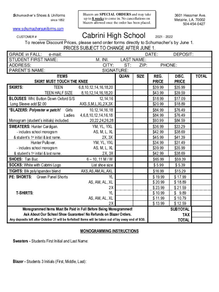 Schumacher Shoes & Uniforms since 1852Blazers are SPECIAL ORDERS and may take up to 8 weeks to come in. No cancellations on blazers allowed once the order has been placed.3601 Lesser Ave. Metairie,