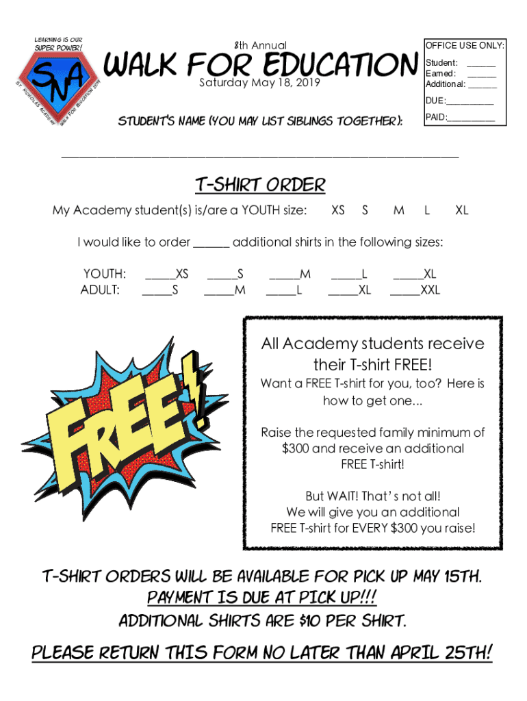 Learning is our8th Annual superpower! SNA Walks for Education 20nic. Student: Earned: Additional: DUE: KEM yWaadFoAcrsEdlaucathoioSt19Saturday May 18, 2019OFFICE USE ONLY:Students NAME (You may list